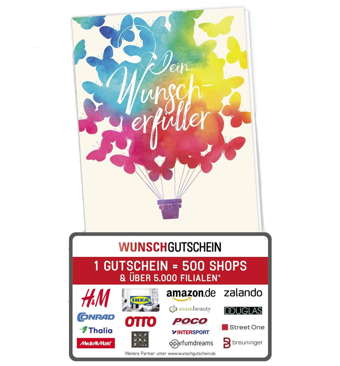 Als Dankeschön für Deine Teilnahme an unserer Umfrage verlosen wir 21 digitale Wunschgutscheine – einlösbar in mehr als 500 Onlineshops wie Amazon, Adidas, H&M, Media Markt, OTTO, Sephora, Zalando und vielen weiteren: