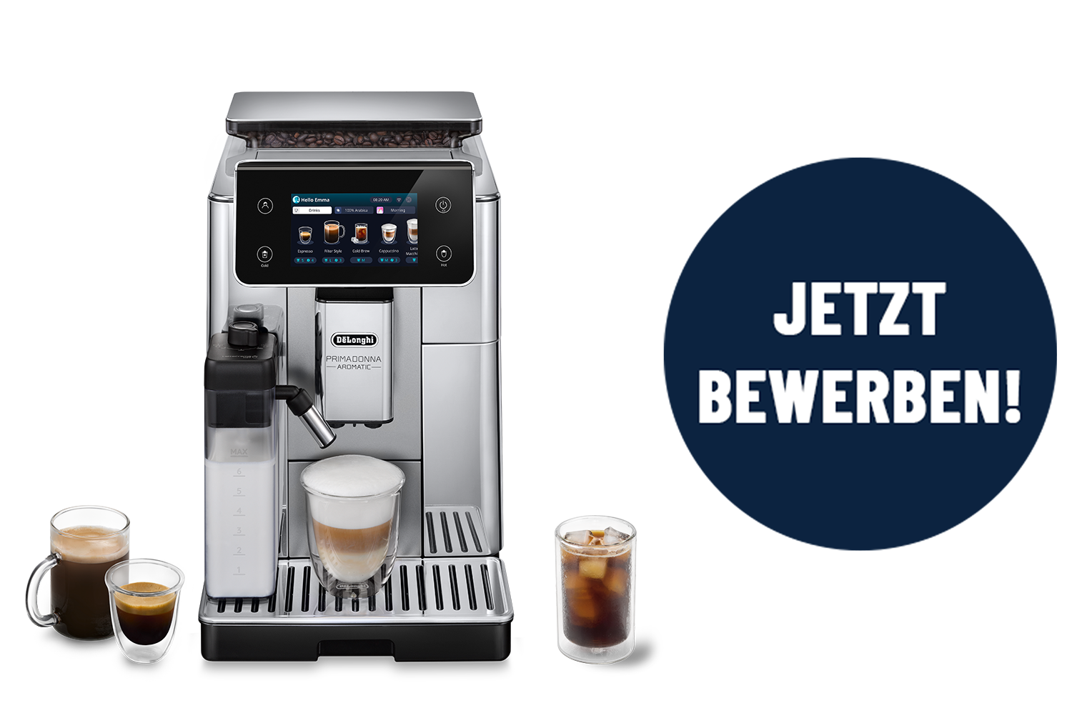 Wir suchen 24 Kaffee- und Design-Liebhaberinnen, die die brandneue PrimaDonna Aromatic von De’Longhi gerne mit eigenen Augen sehen und damit perfekten italienischen Kaffeegenuss genießen möchten. Zur Auswahl stehen zwei Modelle, die sich in ihrer Ausführung ganz leicht unterscheiden: